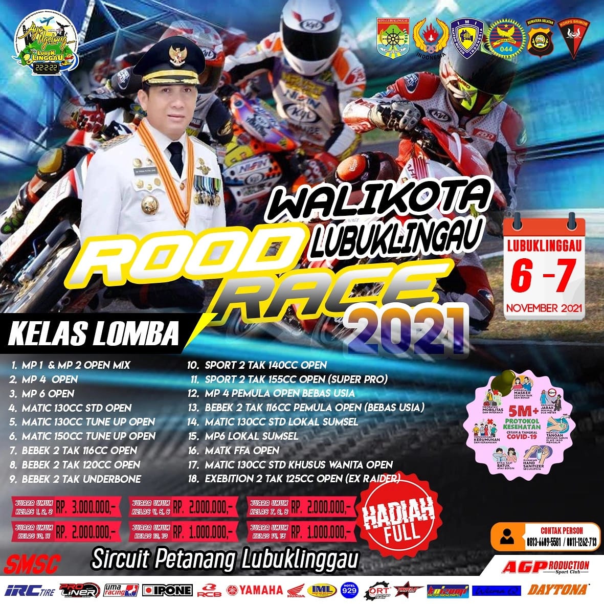 OtomotifZone.com- Lubuklinggau Gelaran event Road Race Piala Walikota Lubuklinggau yang yang akan dilaksanakan pada awal November nanti (6-7/11/21) di sirkuit non permanen GOR Petanang Kota Lubuklinggau siap diselenggara. Di mana pada event kali ini AGP Production selaku Event Organizer mempersiapkan 20 kelas dan 6 kategori Juara Umum.