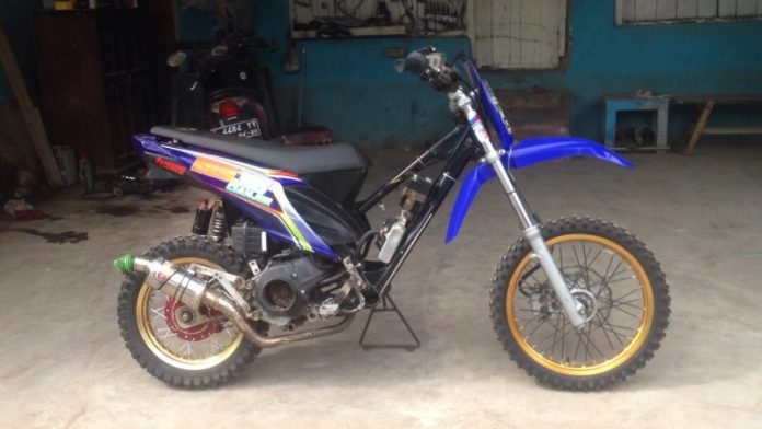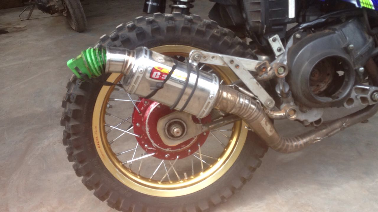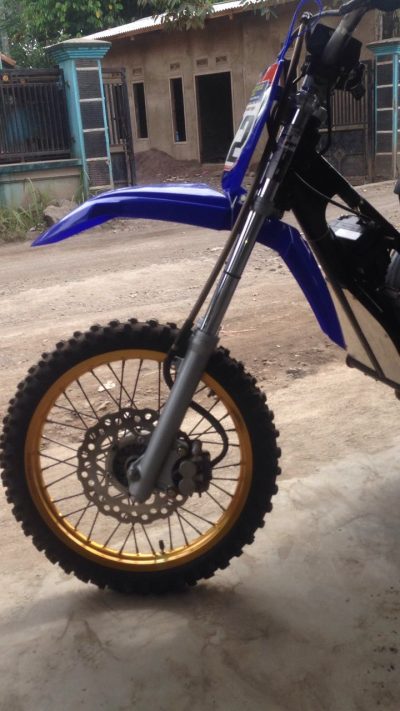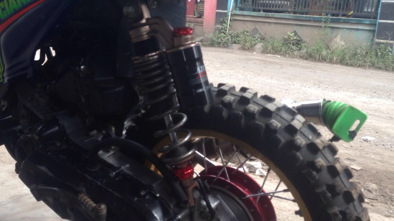 “Shok depan pake tele klx, trombol depan klx,ban depan dan belakang dunlop geomax,shok belakang kitaco extrime dan knalpot cld c3”.