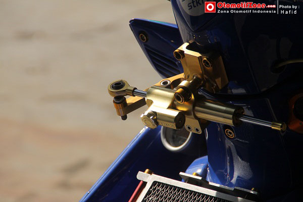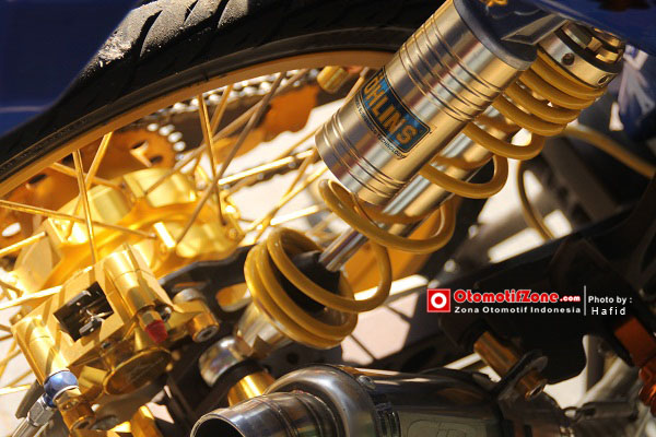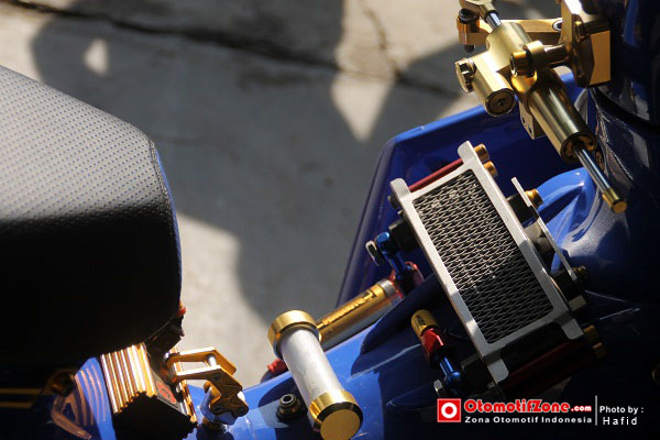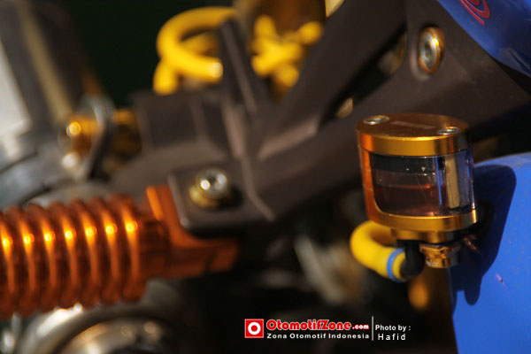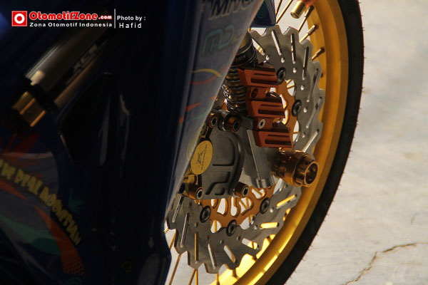 Modif seperti ini memang paling utama adalah memainkan kaki-kaki. Karena bodi hanya di mainkan lewat stiker. Tromol depan dan belakang harus dibuat mewah dengan memilih warna emas bronze. Sektor bawah harus dibuat serapi mungkin dengan tambahan aksesoris kecil yang menambah kesan elegan.