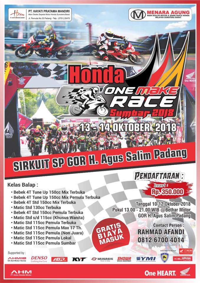 OtomotifZone.com – Padang. Honda Menara Agung dan PT Hayati Pratama Mandiri, sebagai main dealer Honda di Sumatera Barat bekerja sama untuk menggelar event Honda One Make Race Sumatera Barat 2018 yang rencananya berlangsung di sirkuit GOR H Agus Salim Padang, Sumbar akhir pekan ini (13-14/10). Kedua main Dealer Honda di Sumatera Barat ini menunjuk Bethar sebagai pelaksana event sebab track record Bethar cukup di akui dan di segani oleh para pembalap Sumatera Barat.