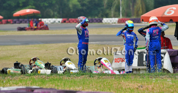 OtomotifZone.com-Sentul Bogor. usai bendera finish dikibarkan setelah berputar selama 22 lap yang digelar Panitia RMC Indonesia di final Junior Max Minggu (28/9) sontak dan serentak 4 gokart pembalap berhenti berbaris teratur ditikungan pas didepan pos 6 yang posisinya sedikit serong dari posisi track lurus start Gate sirkuit sentul kecil.