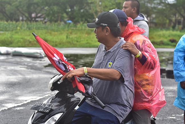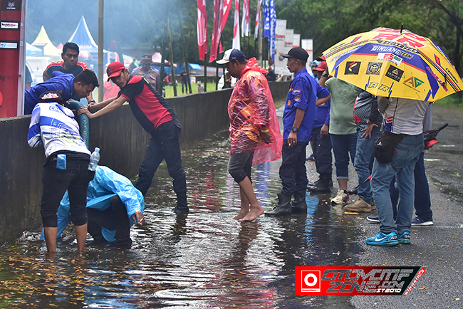 Namun tanpa terprediksi rintik hujan pun mulai turun dan tak lama kondisi sirkuit pun berangsur gelap dan Byarrrrr…. ya hujanpun turun tak terkendali hampir 30 menit menutupi lintasan yang digenangi air. Usai hujan reda tanpa basa basi petugas lintasan dibantu tim Pemadam berupaya menguras air keluar lintasan tentunya dengan sigap Multazam sebagai pimpinan lomba kali ini bergerak cepat mengkomandoi untuk dapat melanjutkan beberapa race tersisa.