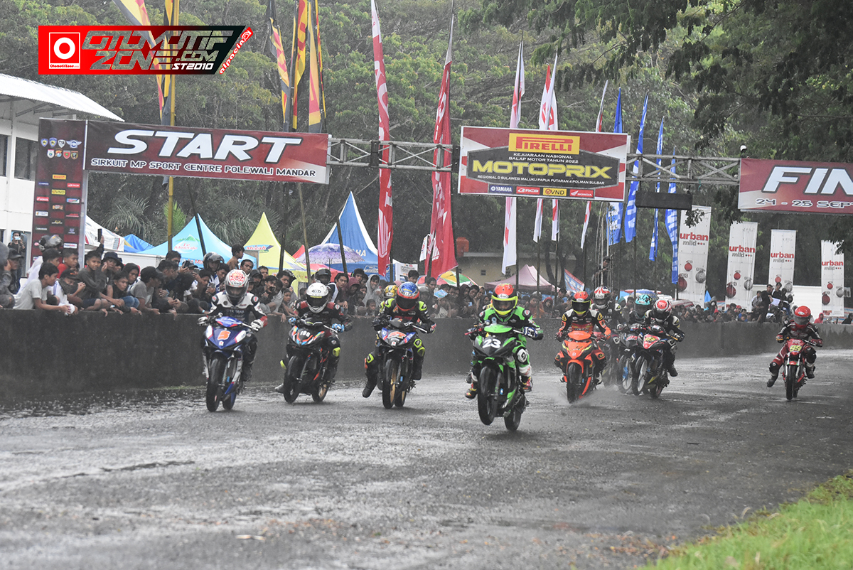 OtomotifZone.com – Polman. Sempat tertunda disebabkan hujan yang cukup Deras pada gelaran Final Kejurnas Motoprix Region D Sulawesi, Maluku dan Papua 2022 Putaran ke 4 yang digelar di sirkuit Sport Center Polewali Mandar, Sulawesi Barat pada hari Sabtu 24 September 2022.