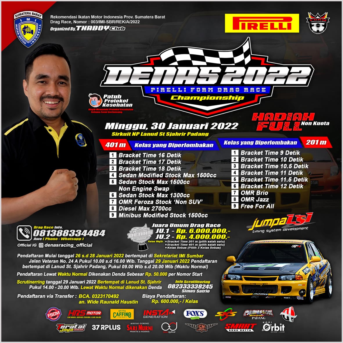 OtomotifZone.com – Padang. Akhir bulan ini Sumatera Barat akan menghelat event besar besaran. Event balap Drag Race Denas 402 & 201 meter akan tersaji (30/1/22) di Sirkuit NP Lanud ST Sjahir Padang, Sumatera Barat. Hadiah berlimpah menjadi daya tarik tersendiri untuk konsep event ini. Kalian pasti menyesal bila tidak mengikuti event ini.