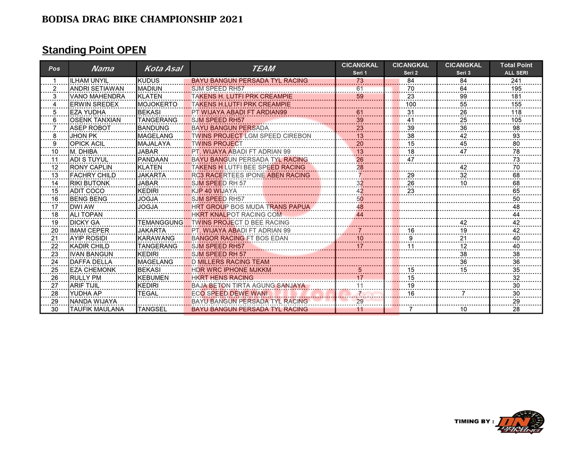Setelah sekian lamanya kegiatan drag bike berlangsung dari putaran pertama hingga ke empat. Pada papan klasemen sementara, torehan point yang tertinggi berhasil dicapai oleh pembalap dari Bayu Bangun Persada TYL Racing, Ilham Unyil. Trondolo Kudus yang beberapa waktu sebelumnya berhasil juga memecahkan rekor best time Nasional, pada drag bike Bodisa 2021 meraup point sebanyak 241 di all seri.