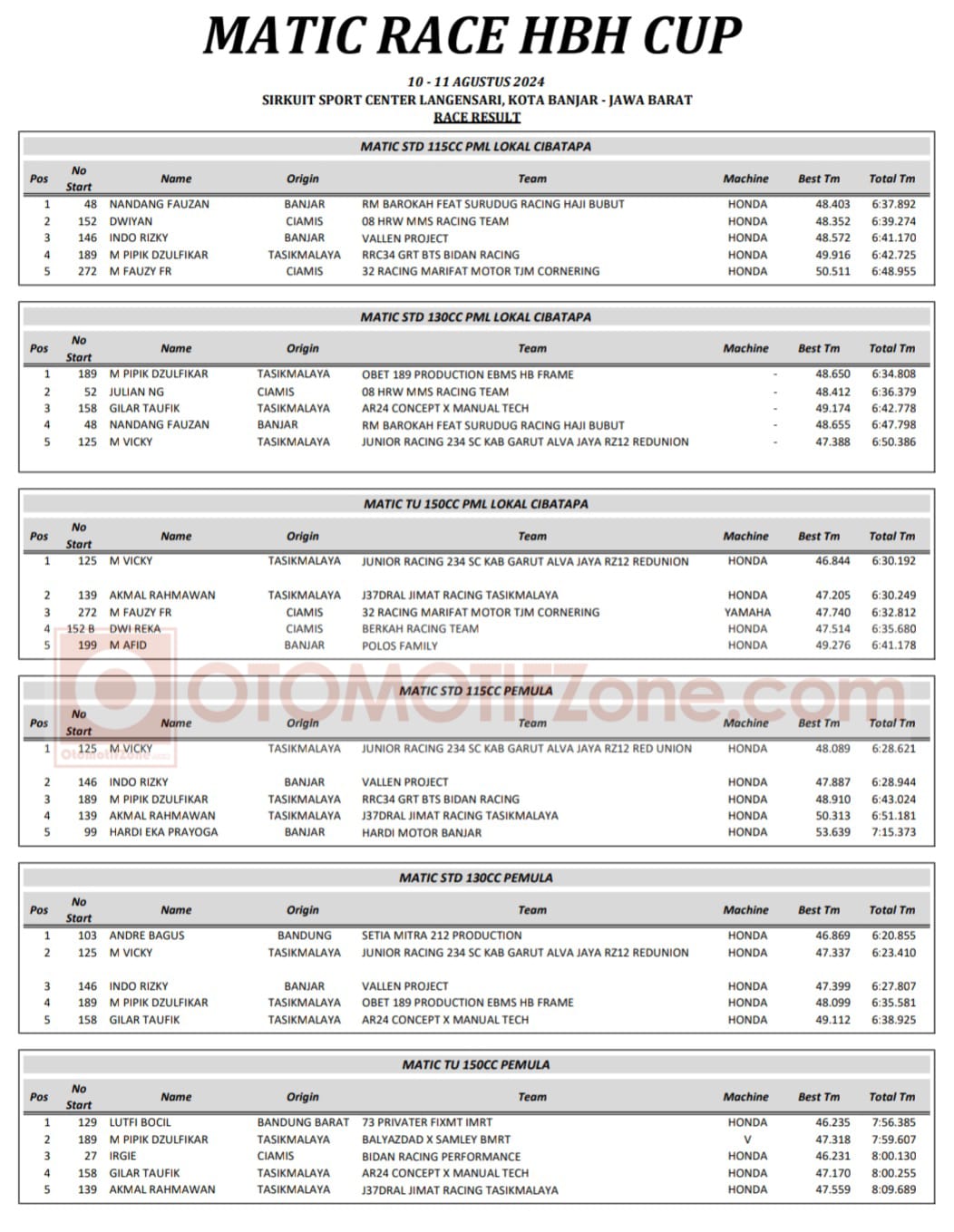 OtomotifZone.Com – Banjar. IMB Matic Race HBH Cup 2024 yang berlangsung di Kota Banjar Provinsi Jawa Barat telah selesai digelar Sabtu – Minggu (10-11/08/2024). Gelaran berlangsung di sirkuit kebanggan warga Kota Banjar yaitu sirkuit dadakan Sport Center Langensari Kota Banjar, berikut hasil lengkapnya: