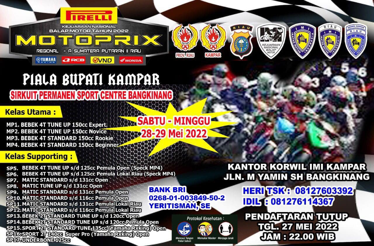 OtomotifZone.com – Pekanbaru. Akhirnya Kejuaraan Nasional Motoprix pulau Sumatera akan berlangsung. Setelah putaran 1 ditunda jadwalnya, akhirnya Riau akan menjadi partai pembuka Kejurnas Motoprix Region A (28-29/5/22) di Sirkuit Sport Center Bangkinang, Riau. IMI Korwil Kab. Kampar akan menjadi penyelenggara. Yang mana seharusnya Riau menjadi tuan rumah putaran kedua. Akan tetapi putaran pertama Jambi harus diundur Jadwalnya.