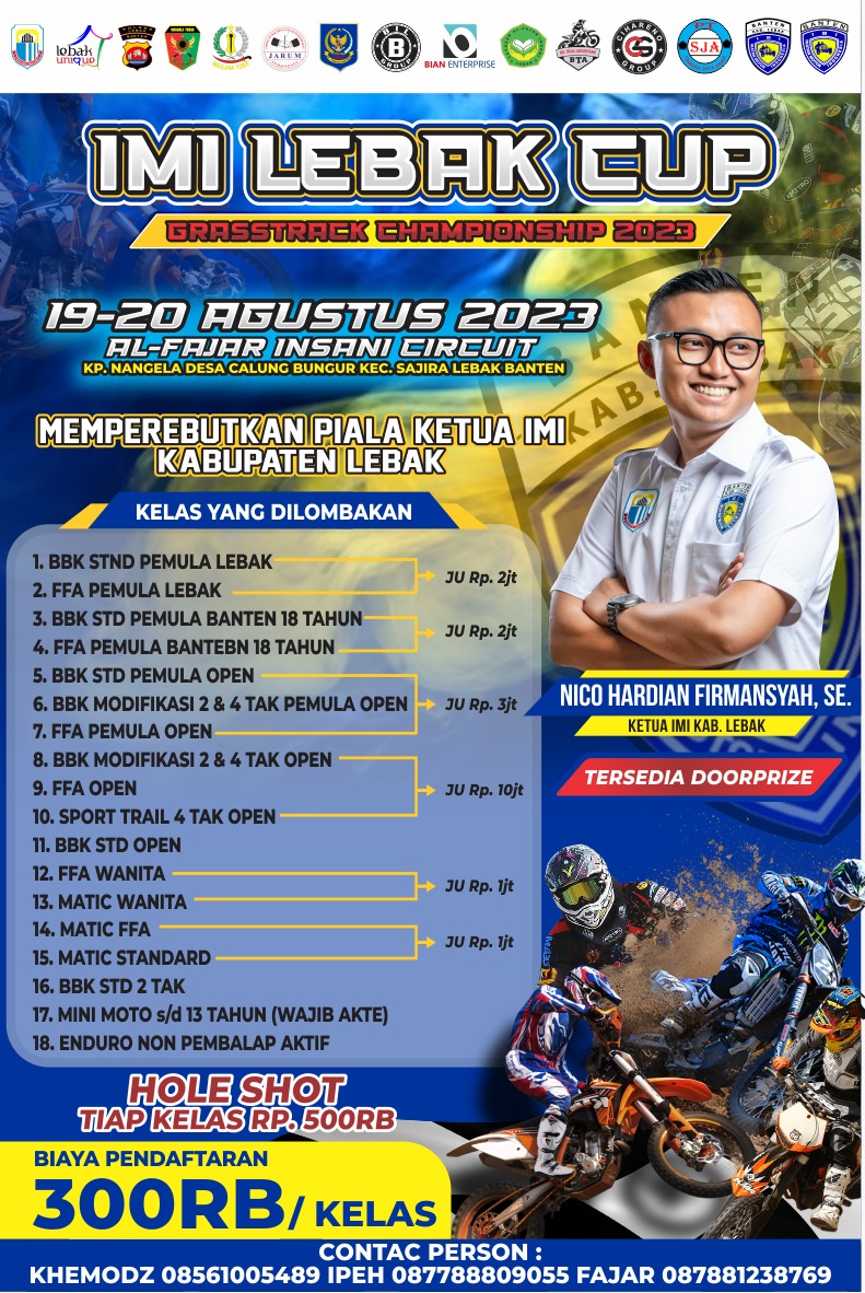Semoga IMI Lebak Cup Grasstrack Championship 2023 menjadi acara yang sukses, penuh dengan aksi balap yang seru dan semangat sportivitas yang tinggi. Saya berharap semua peserta dan penonton menikmati acara ini dengan aman dan sukses