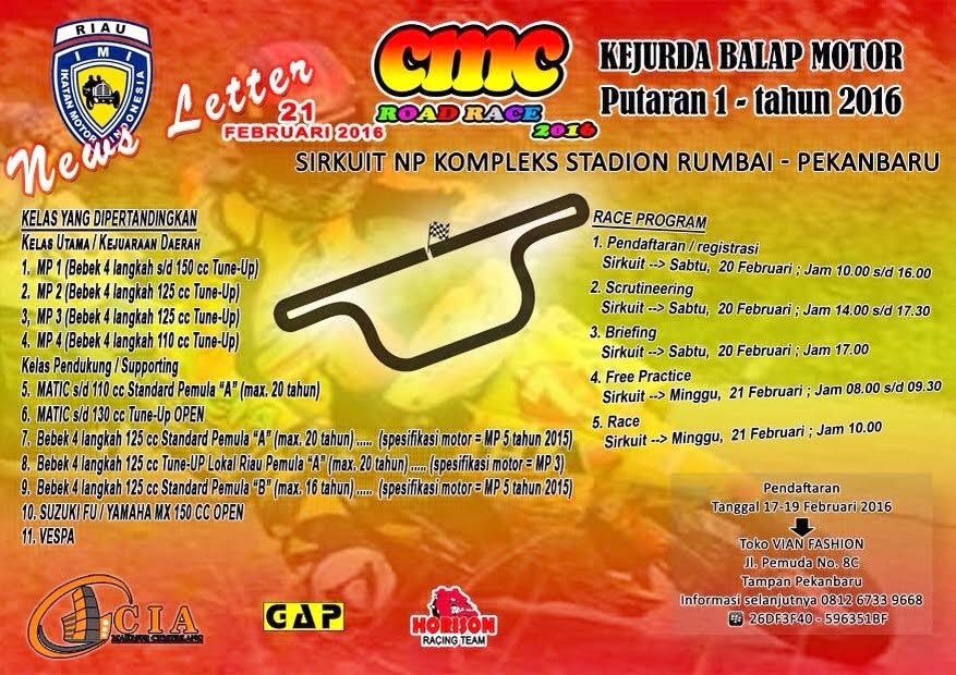 Ko bisa bro…ya dong, yang lain bikin program kerja, naah CMC selaku club penyelenggara dibawah naungan IMI Riau malah akan menggelar “CMC Kejurda Balap Motor seri 1 2016”, Minggu 21 Februari mendatang di sirkuit NP komplek Stadion Rumbai Pekanbaru, Riau.