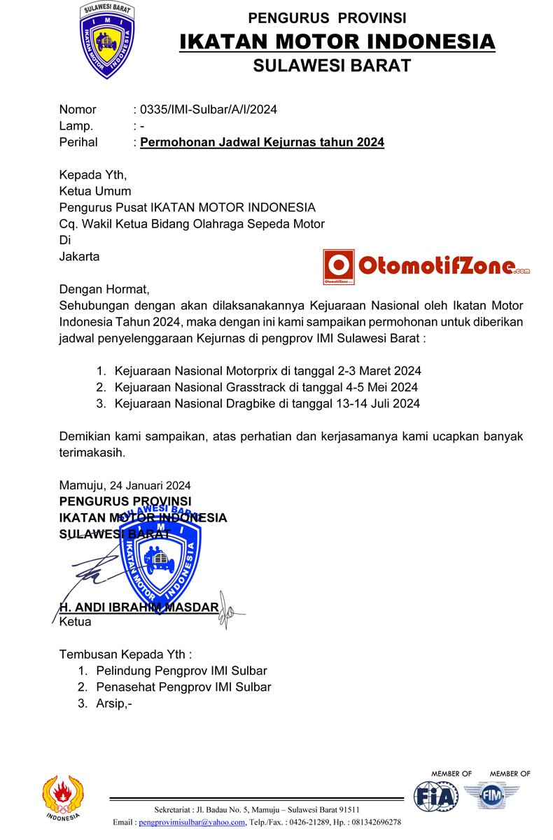 OtomotifZone.com – Jakarta. Melanjutkan berita mengenai Kejurnas Motoprix region D putan pertama, ternya Pengurus Provinsi Sulawesi Barat memiliki jawaban paten. Pihak provinsi menjagal pernyataan bahwa IMI Sulawesi Barat belum mengajukan. Tapi disini IMI Sulawesi Barat memberikan bukti secara real.