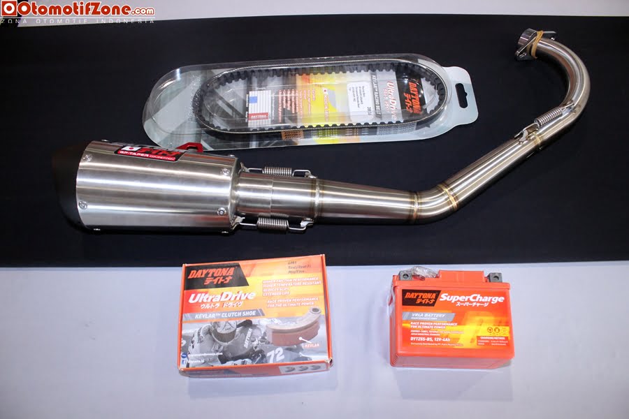 Empat Itemnya sendiri adalah Knalpot, Batrey atau Aki, V-belt dan kampas Ganda. Dari ke empat item ini akan mereka kenalkan di INDOCLUB putaran 2 (23-24/3) di Sirkuit Gerymang Subang. Dan dari ke empatnya memiliki keunggulan tersendiri menurut pihak Daytona. Kalau bisa diamati, empat item ini merupakan part part motor Matic