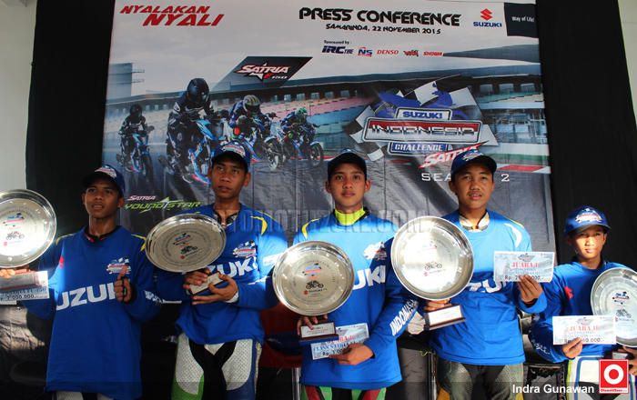 OtomotifZone.com – Samarinda. Gelaran Suzuki Indonesia Challenge season 2 di sirkuit Kalan Samarinda, Kalimantan Timur telah usai digelar, Minggu (22/11). Lima pebalap terbaik terdiri dari 3 pebalap di kelas Satria Cup dan 2 pebalap Young Star berhak melaju ke final SIC season 2 di Sentul bertanding bersama jawara SIC kota lainnya, pada 20 Desember 2015 mendatang.