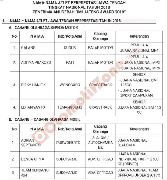 OtomotifZone.com-Semarang. Beberapa pembalap meraih penghargaan yang di berikan IMI Jawa Tengah pada acara Rakerprov dan IMI Jateng Award 2018 tak lain acara penobatan atlet balap terbaiknya tahun lalu. Bertempat di The Bandungan Hotels 2 Februari 2019, pembalap roda dua dan roda empat di ambil prestasi terbaiknya dalam kejuaraan Nasional. Berikut daftarnya.