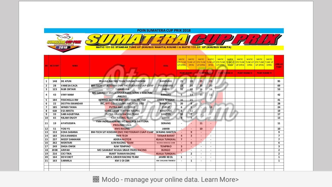 Ingat IRC Sumatera Cup Prix baru berjalan 2 seri dan masih menyisakan 3 seri lagi. Yang mana masih membuka peluang pembalap lainnya meraih poin tertinggi. Untuk klasemen sementara, berikut data lengkapnya: