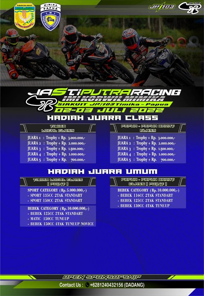 OtomotifZone.Com – Timika. Setelah sukses helat dua seri Open road race sebelumnya yang ramai didatangi pembalap papan atas Nasional. Jasti Putra akan Kembali menggelar kejuaraan berkolaborasi bersama IMI Korwil Mimika dengan tajuk gelaran Jasti Putra Racing IMI Korwil Mimika yang akan dilangsungkan di Sirkuit JR 103 Timika, Papua 2-3 Juli 2022.