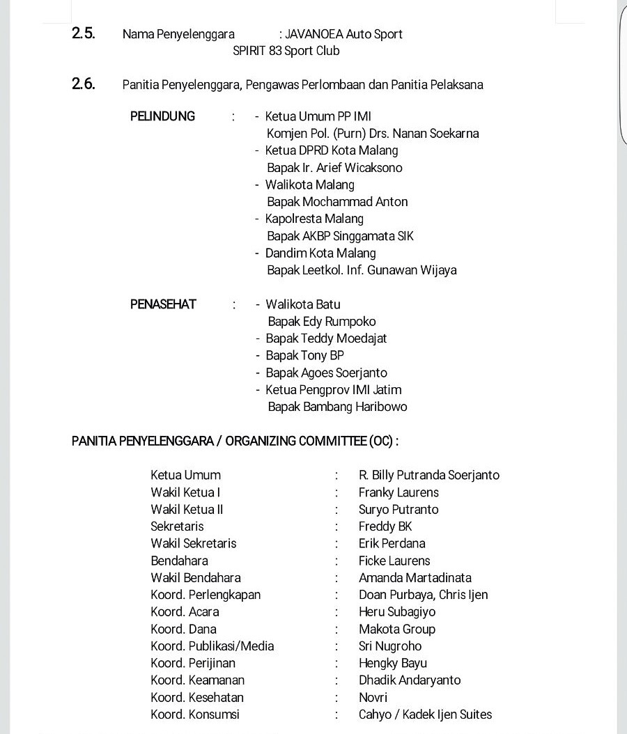 “Dalam final kejurnas time rally nanti, perally-perally nasional akan hadir. Tak terkecuali senior-senior seperti: Radix Malaka, Armand, Helmy Sungkar, Ria Sungkar, dan Farid Sungkar. Tidak ketinggalan mantan ketua IMI Jatim Anton Abdullah juga akan meramaikan even ini,” terang R Billy Putranda, perally asal Malang yang didapuk sebagai ketua penyelenggara.