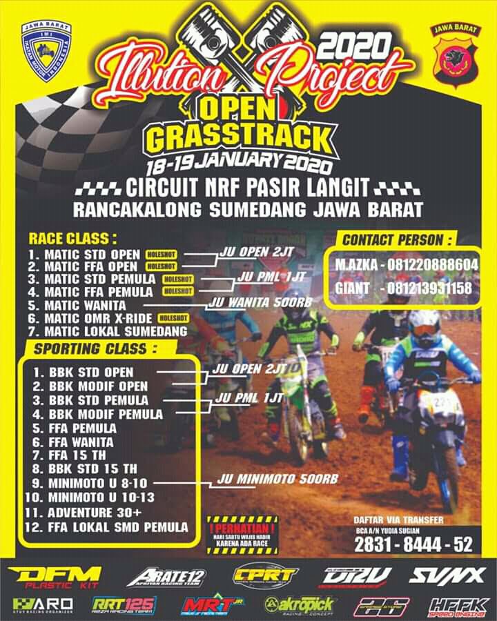 OtomotifZone.com – Sumedang. Balapan motor tanpa gigi persneling alias matik memang sudah mulai masuk dan ramai dibuka kelasnya di lintasan tanah pada beberapa waktu lalu dan hingga saat ini. Itu pula yang jadi acuan dalam gelaran bertajuk Illution Project Open Grasstrack 2020 di sirkuit NRF Pasir Langit, Rancakalong, Sumedang, Jawa Barat, akhir pekan ini (18-19/1). Yaitu dengan menayangkan sebanyak tujuh kelas utama khusus matik yang di sandingkan dengan 12 kelas campuran sebagai gelaran pendukungnya.
