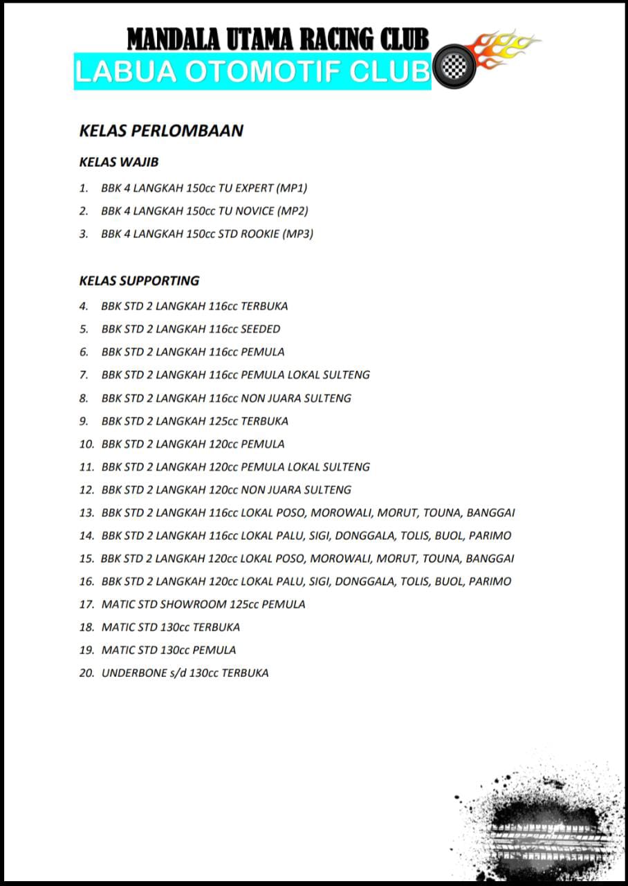 Tapi beberapa club tetap ingin mengusahakan event. Seperti event besok ini, penyelenggara akan mencoba mengurus perizinan untuk menjalankan Kejurda. Ada 20 kelas dalam event ini yang dijalankan. Semoga semua perizinan berjalan lancar dan event digelar sesuai jadwal. Berikut daftar kelas yang diperlombakan :