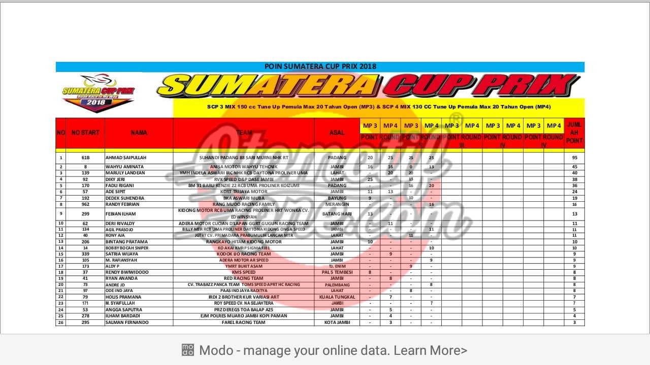 Memang pada seri 2 beberapa tim dan pembalap baru datang untuk mengikuti. Salah satunya seperti tim Suhandi Padang 88 yang baru ikut di seri 2. Dan pada seri 3 nanti prediksi beberapa tim dan pembalap baru akan ikut memanaskan persaingan. Yang pasti dengan demikian dengan hadirnya beberapa pembalap baru bisa merusak perolehan point saat ini. Untuk sementara, berikut hasil klasemen sementara sampai seri 2: