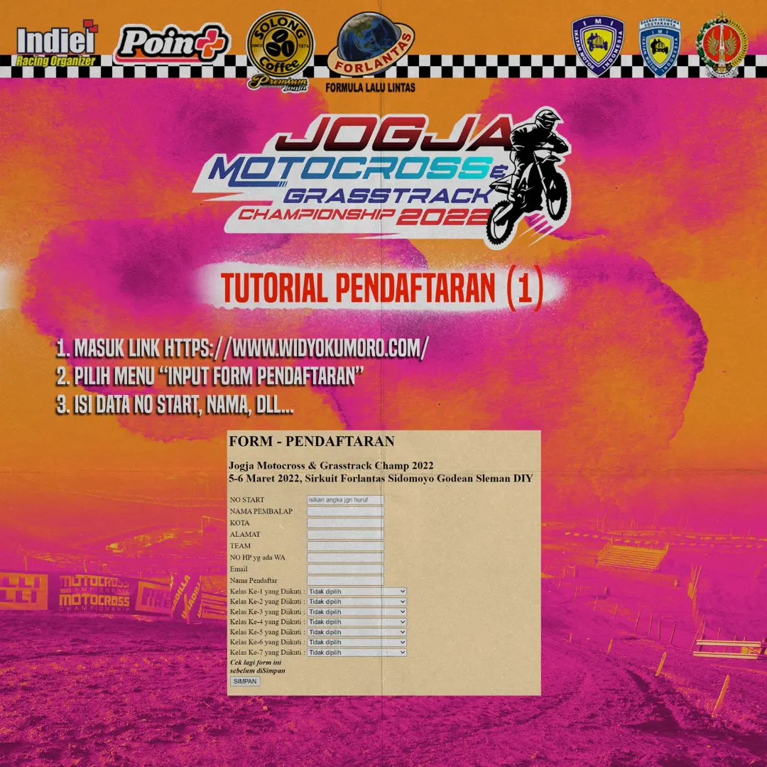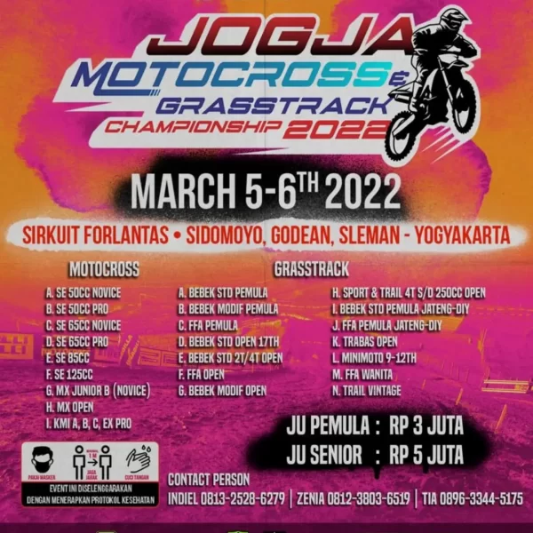 OtomotifZone.com-Jogja. Fix pekan ini Jogja Motocross Grasstrack sirkuit Forlantas, Sidomoyo, Godean, Sleman, Jogjakarta 5-6 Maret 2021 jadi di laksanakan. Bukan event ragu-ragu karena Point Plus Management Jogja merombak total sirkuit lama Forlantas. Seminggu pengerjaan line baru mereka sudah update kelas dan pendaftar online.