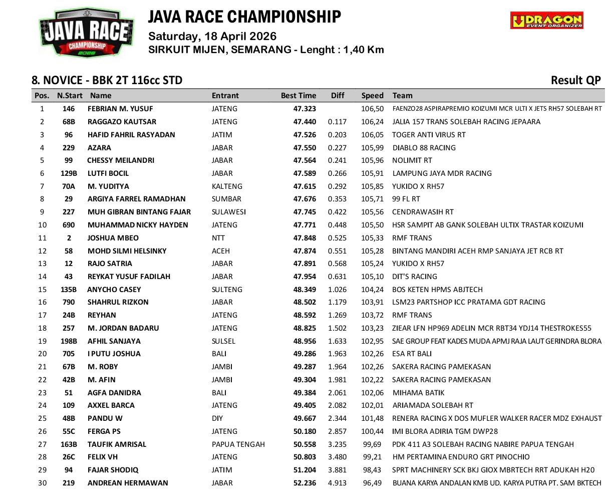 Dengan hasil ini, tim Faenzo Racing dipastikan akan memulai balapan dari grid pertama. Keunggulan teknis dari garapan Solebah dipadukan dengan gaya balap agresif namun rapi dari Febrian Yusuf menjadi modal kuat untuk meraih podium tertinggi pada balapan utama nanti.