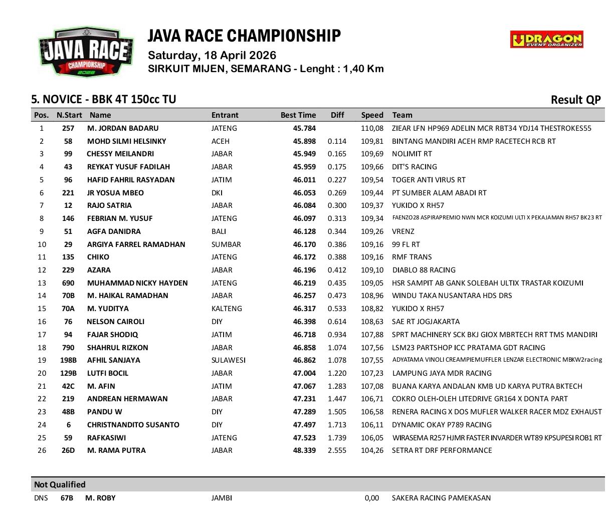 Sesi QTT kelas Novice kali ini disebut-sebut sebagai salah satu yang paling memukau di seri perdana Mijen. Perebutan waktu terbaik berlangsung sangat krusial karena hampir semua pembalap memiliki pace yang setara.