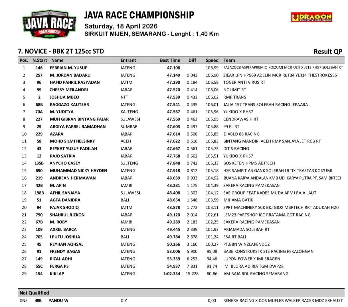 OtomotifZone.com – Semarang, Sesi kualifikasi (QP) kelas Bebek 2T 125cc STD Novice pada gelaran Java Race Championship (JRC) 2026 Sabtu (18/4) berlangsung sengit. Namun, nama Febrian M. Yusuf langsung mencuri perhatian sesaat setelah keluar dari waiting zone.