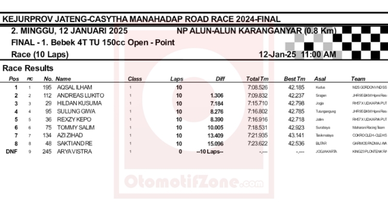 OtomotifZone.com – Karanganyar. Salah satu kelas yang harus di simak pada Final Casytha Manahadap Road Race sirkuit Alun-alun kota Karanganyar, Jawa Tengah 12 Januari 2023 adalah kelas Bebek TU 150cc Open. Point Aqsal Ilham cukup aman-aman cemas. Dia mengumpulkan 198 point dan di bawahnya Agus Setyawan 129.