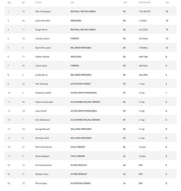 Jarak gap Max vs Lewis kini menjadi 12 point. Max Verstappen mengantongi 287,5 sedangkan Lewis Hamilton 275,5. Berikut hasil race F1 Cota.