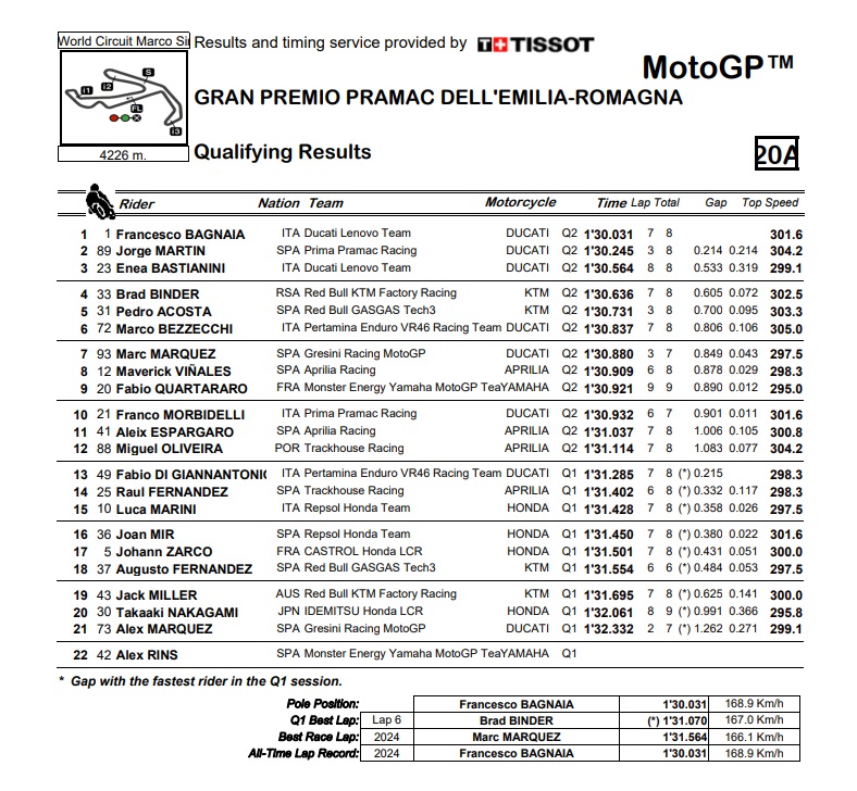 OtomotifZone.com – San Marino. Sprint Race MotoGP Emilia-Romagna yang berlangsung sore ini di Sirkuit Misano, San Marino 21 September 2024 meskipun Francesco Bagnaia start terdepan namun cara start Jorge Martin berhasil melesat lebih dahulu di R1. Dan hasilnya ia bisa memimpin balap di depan Bagnaia.