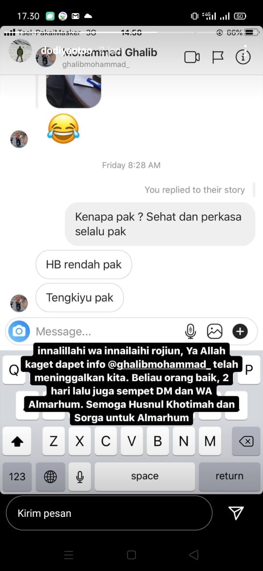 “ Innalillahi wa innailahi rojiun, Ya Allah kaget dapat info @ghalibmohammad_ telah meninggalkan kita. Beliau orang baik. Dua hari yang lalu juga sempat DM dan WA Almarhum. Semoga husnul khotimah dan sorga untuk almarhum,” cetus Dodiyanto pada status media social pribadinya.
