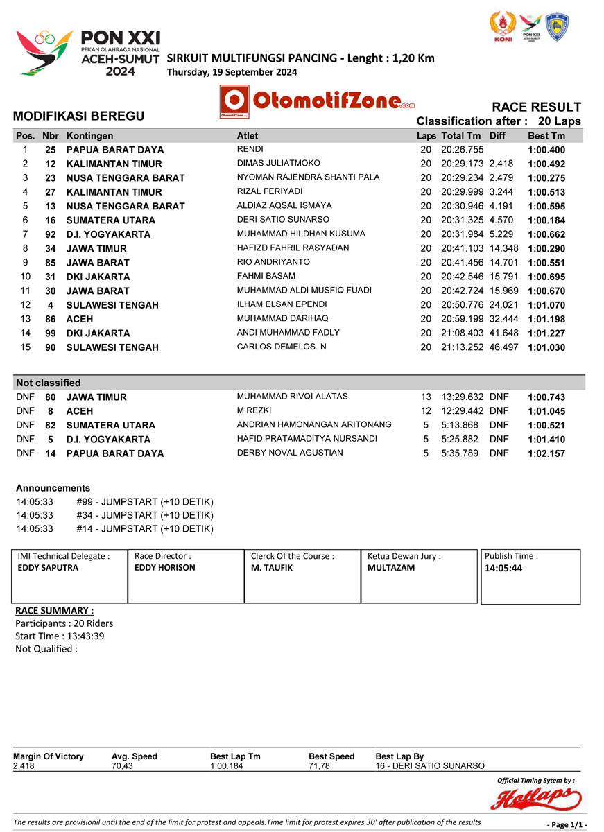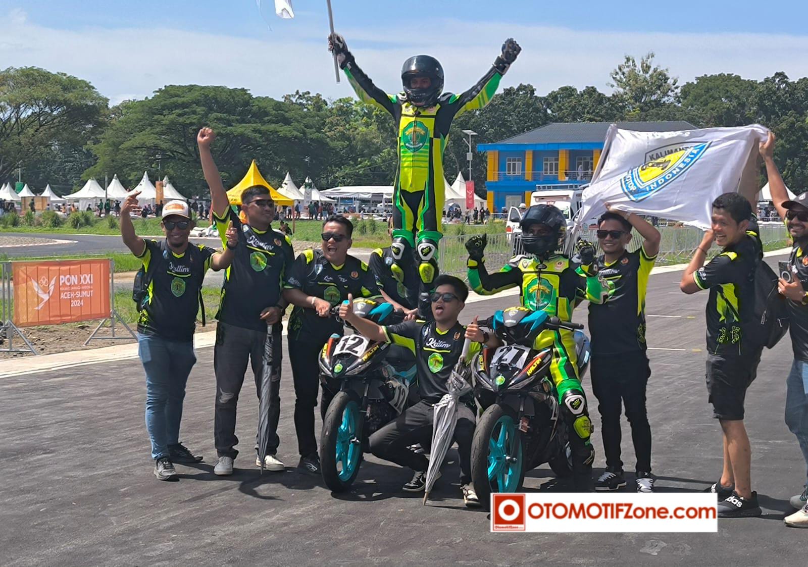 OtomotifZone.com-Medan. Pertarungan kelas Modifikasi beregu memang jauh lebih menegangkan, posisi hasil QTT yang begitu ngacak membuat prediksi berhitung juga membuat sangat sulit menentukan dengan pasti siapa yang juara, hingga beberapa lap sebelum akhirnya 20 lap dituntaskan, 2 kontingen bersaing keras, dimana sebelumnya kontingen NTB sudah memberi harapan besar di hampir lebih dari setengah kompetisi namun Aldiaz melorot diposisi 6 sementara teamnyanya konsisten diposisi 2, namun team Kaltim jauh lebih konsisten menjaga ritme lewat duet mauynya, Dimas Juliatmoko dan Rizal Feriadi, akhirnya memboyong medali Emas PON XXI Aceh Sumut 2024 hari ini, Kamis, 19 September 2024 di sirkuit Pancing Medan Sumatera Utara.