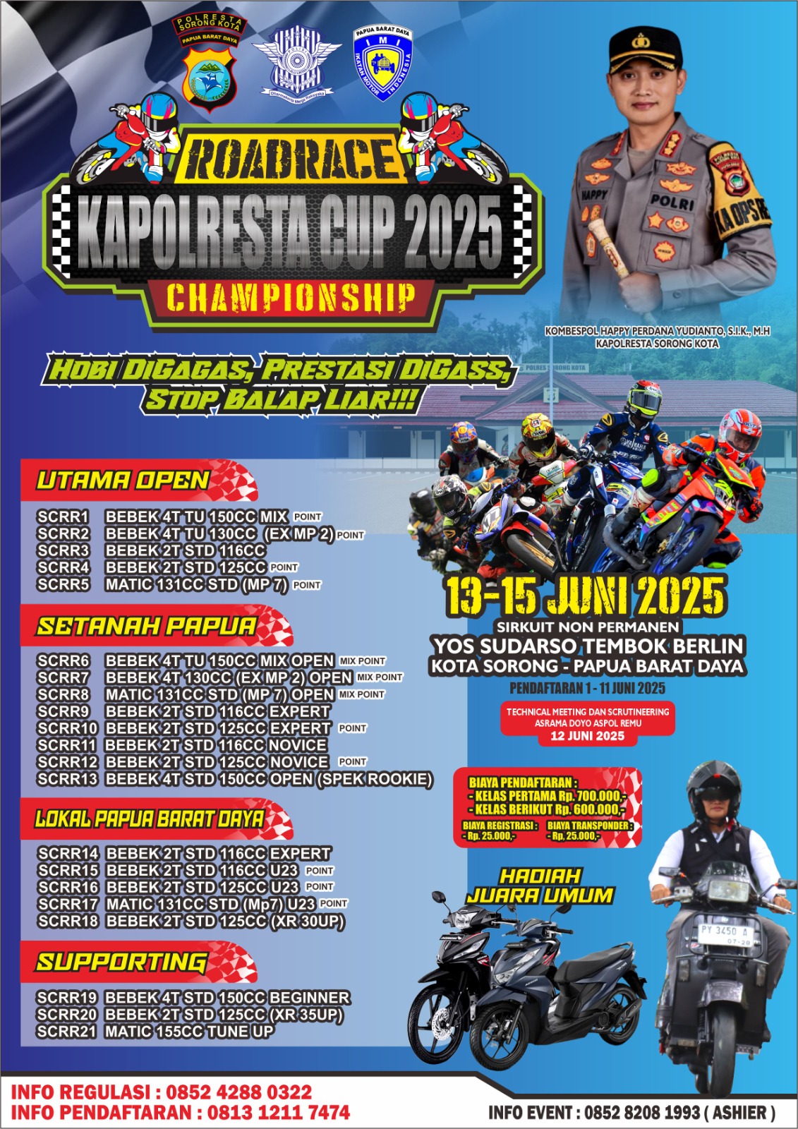 OtomotifZone.com – Sorong, Papua Barat Daya. Dalam upaya mendorong prestasi generasi muda sekaligus menekan maraknya aksi balap liar, Polresta Sorong Kota akan menggelar ajang balap motor resmi bertajuk “Kapolresta Cup 2025 Road Race Championship”. Acara ini dijadwalkan berlangsung selama tiga hari, mulai 13 hingga 15 Juni 2025, bertempat di Sirkuit Non Permanen Yos Sudarso Tembok Berlin, Kota Sorong, Papua Barat Daya.