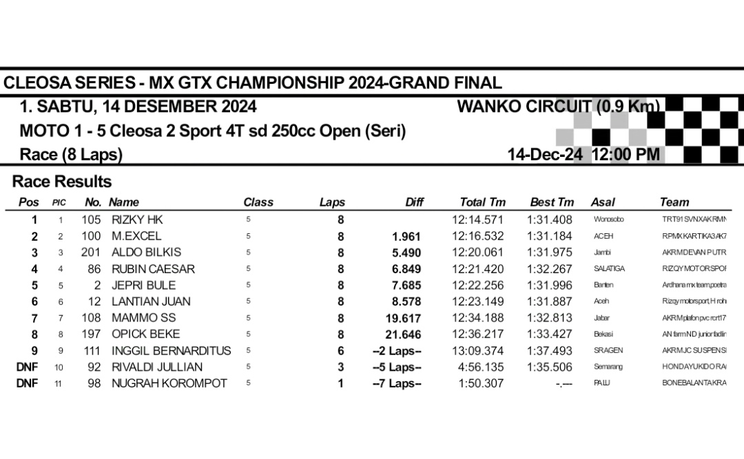 OtomotifZone.com – Semarang. Perjuangan Rizky HK untuk menjadi yang terbaik tak pernah berhenti, dengan aman holeshot pun juga berhasil digenggam yang kemudian berhasil mengamankan Moto 1 trail 250cc Open dengan kemenangan di gelaran terakhir Cleosa Series 2024, Sirkuit Wanko, Bubakan, Mijen, Kota Semarang 14-15 Desember 2024.
