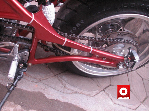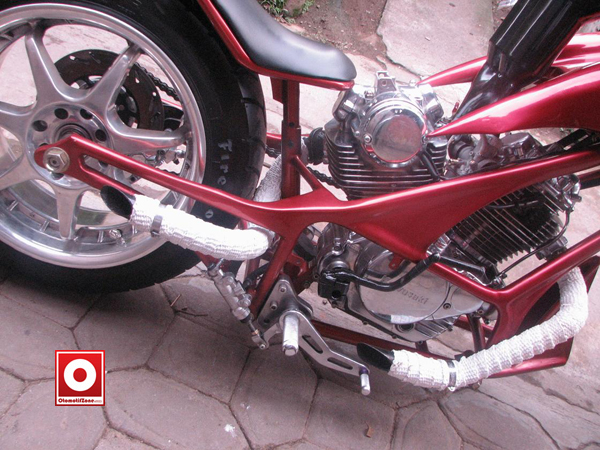 Fokus ubahan tentunya pada pembentukan rangka dulu sesuai dengan konsep yang diinginkan owner, dengan memakai rangka pipa ukuran ¾” diaplikasikan. Setelah penggarapan rangka rampung kini tinggal pembentukan tangki dengan memakai plat ukuran 2mm supaya kuat. Habis itu dipilih cat warna red metalic agar warnanya mencolok dengan sedikit goresan grafis pada bagian tangki.