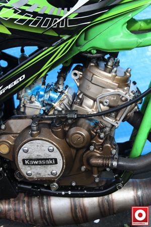 Bermain di Kelas Standart tentu motor yang dipakai pasti standart, tinggal mensetting komponen standart itu presesi dan motor dapat lari kencang. Bagian mesin yang jadi fokus adalah bagian membran, membran yang dipakai masih tetap mengandalkan standart Ninja, bahkan ada dua membran standart yang dipasangkan. Dimana kedua membran tersebut digabung untuk mendapatkan buluh yang lebih kuat tapi tetap fleksibel, nah untuk membran kedua dilakukan pemotongan dengan hanya menyisakan dudukan pada baut. Langkah selanjutnya untuk mendapatkan pemampatan yang lebih besar pada ruang bakar ,kelapa silinder dipapas meskipun tidak ekstrim. “Pemapasan kepala silinder sebesar 0,8mm sehingga mendapatkan perbandingan kompresi sebesar 7,8:1, sedang untuk kompresi bawah juga dinaikkan dengan aplikasi kruk as dari Kawasaki ZX, dengan aplikasi kruk as dari motor tersebut kompresi bawah bisa lebih dipadatkan karena kruk as tersebut mempunyai dimensi yang lebih besar,”terang Agung sang mekanik.