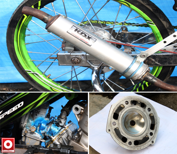 Sedang untuk kelancaran sirkulasi bahan bakar maupun gas sisa pembakaran, lubang exhaust mendapatkan perhatian khusus. Dimana lubang tersebut dibenahi dengan melakukan ubahan tinggi dinaikkan 5mm, sedangkan lebarnya ditambah 2mm samping kanan dan kiri. “Karburator sebagai pensuplay bahan bakar jelas mendapatkan sentuhan, karburator tampak luar standart tetapi boleh melakukakn ubahan di dalam, untuk urusan pengabut bahan bakar memilih melakukan reamer sebesar 30 dengan ubahan tersebut laju bahan bakar menjadi lebih lancar,”tutup Agung sang mekanik.