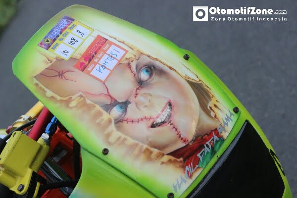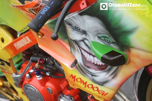 Cover lawas Kawak Ninja membungkus tubuh depan motor milik Momogi. Tampilan warna segar namun seram tampang boneka Chuky dan si Joker. Studio modif JBAST Modified Ngawi di bantu rekan-rekannya membuat konsep sekaligus merencanakan sebuah tampang yang bisa sekaligus buat kontes.