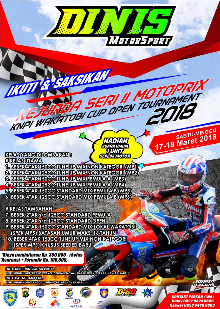 Akhirnya Muhridin, Owner Cemara Dive Center sbeagai pemilik club Dinis Motorsport Kendari bersatu padu dengan Aksar Saputra ketua KNPI Wakatobi untuk mewujudkan mimpi masyarakat Kabupaten Pulau Wakatobi agar bisa menyaksikan gelaran Balap Motor di daerah mereka.