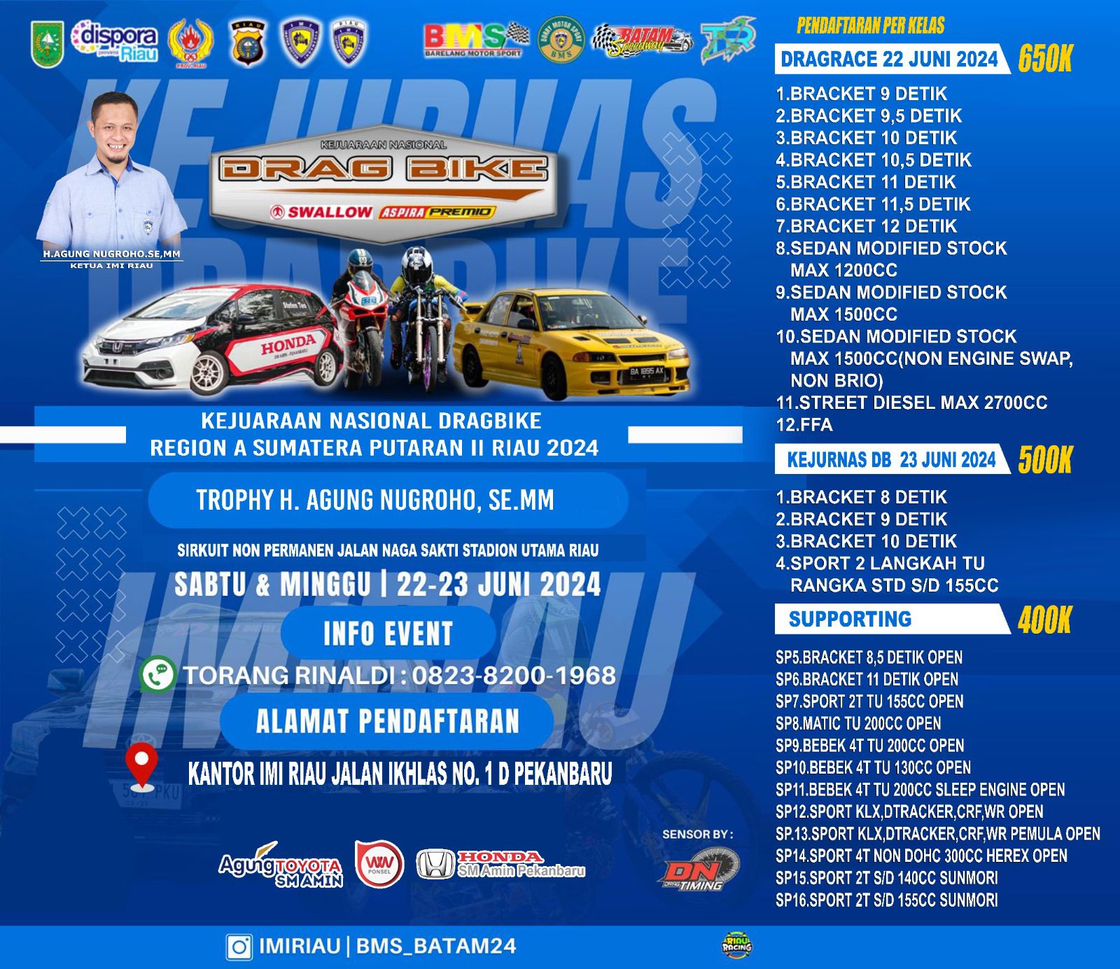 Lalu panitia juga akan membuka kelas Drag Race. Ada 12 kelas yang dilombakan pada kelas Drag Race. Ayo siapkan kendaraan andalan kalian untuk mengikuti gelaran ini. Jangan sampai ketinggalan dan pantengin terus beritanya di Otomotifzone