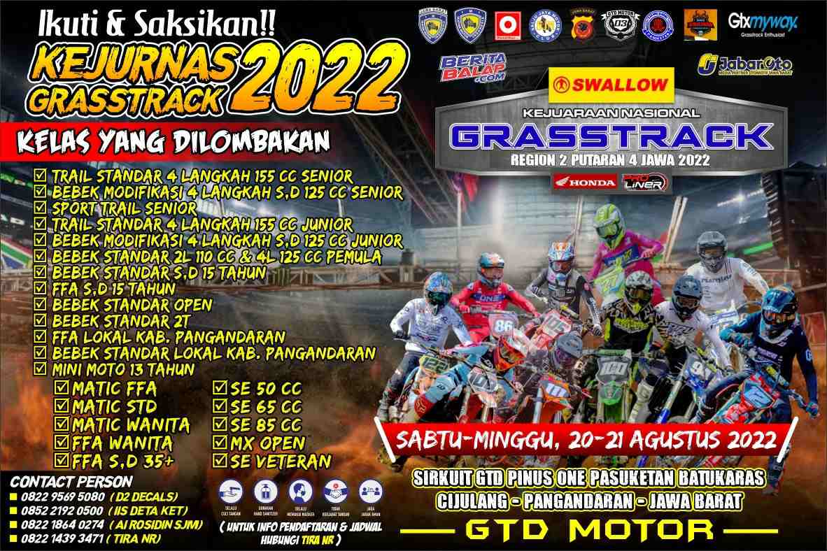 OtomotifZone.Com – Pangandaran. Kejuaraan Nasional (Kejurnas) GTX putaran 4 region 2 Jawa 2022 akan berlangsung di Kabupaten Pangandaran Jawa Barat. Sirkuit GTD Pinus One pasuketan Batukaras akan menjadi tempat berlangsungnya gelaran bertajuk Swallow Kejuaraan Nasional Grasstrack, Sabtu-Minggu (20-21/8/2022).