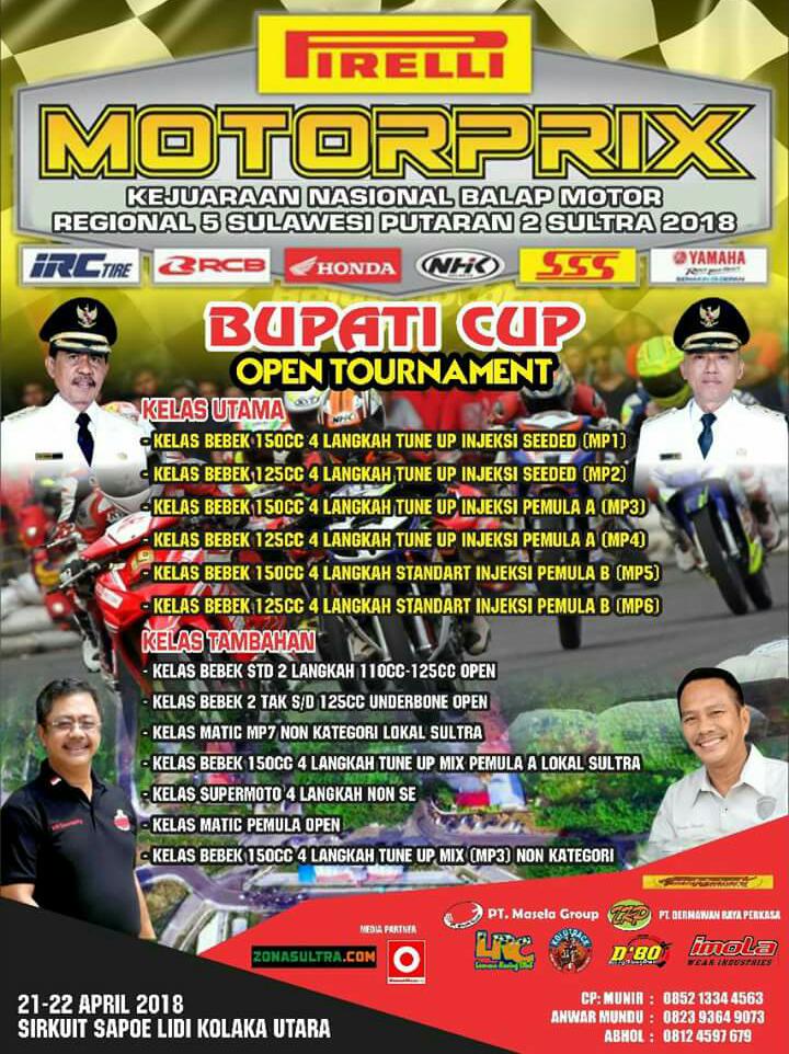 Otomotifzone.com Sulawesi Tenggara. Gass pollll, itulah kata yang paling tepat untuk kita jadikan sebagai Tagline dalam gelaran Kejurnas Motorprix Putaran ke 2 Region V rencananya akan dilaksanakan di sirkuit Permanen SapueLidie Kota Lasusua, kabupaten Kolaka utara Sulawesi Tenggara 21-22 April 2018.