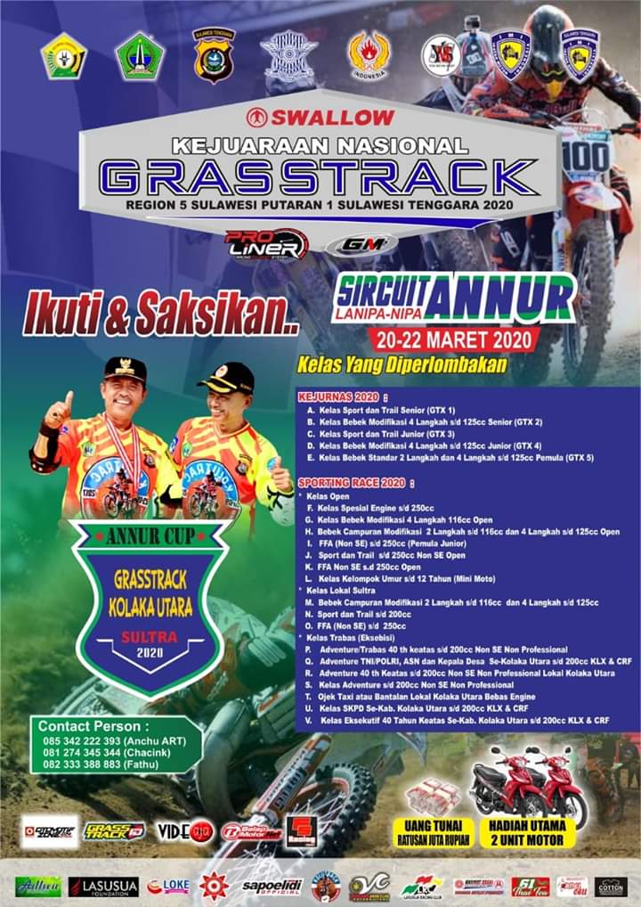 OtomotifZone.com – Sulawesi Tenggara. Kejuaraan Nasional alias Kejurnas Swallow Grasstrack 2020 yang memasuki Putaran 1 untuk Region 5 Sulawesi akan segera bergulir dan di gelar di sirkuit Annur, Lanipa-nipa, Kolaka Utara, Sulawesi Tenggara, (20-22/3). Ajang kali ini merupakan hasil kerjasama antara IMI Korwil Kolaka Utara dengan beberapa klub serta komunitas trail untuk dapat mengadakan seri pembuka event balap garuk tanah dengan level Kejurnas ini.