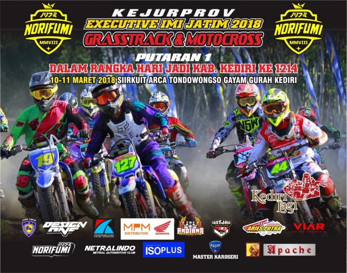 OtomotifZone.com – Kediri. Kabupaten Kediri, Jawa Timur bakal menggelar even bertajuk Kejurprov Executive IMI Jatim 2018, GrassTrack dan Motocross putaran 1 pada Sabtu-Minggu (10-11/3) pekan depan.