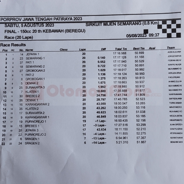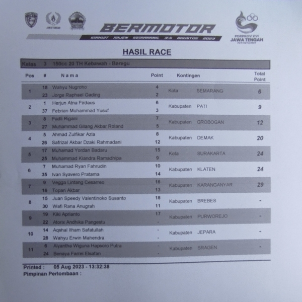 OtomotifZone.com-Semarang. Kegembiraan meluap di Porprov Jateng sirkuit Mijen, Semarang 6 Agustus 2023, ketika pertarungan sengit antara para pembalap muda dari FOBM Semarang dan FOBM Jepara. Kelas Beregu Under 20th menjadi panggung aksi seru, dengan FOBM Jepara berhasil finish terdepan, sementara FOBM Semarang meraih gelar juara dalam pengumpulan poin.