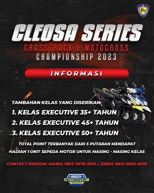 OtomotifZone.com-Semarang. Hampir tak mendapat perhatian dari pemerhati balap garuk tanah namun untuk Cleosa Series 2023 kelas Executive ini akan mendapat hal khusus tentang hadiah yang akan di berikan. Tak tanggung-tanggung. Ada tiga kelas yang akan mereka berikan.