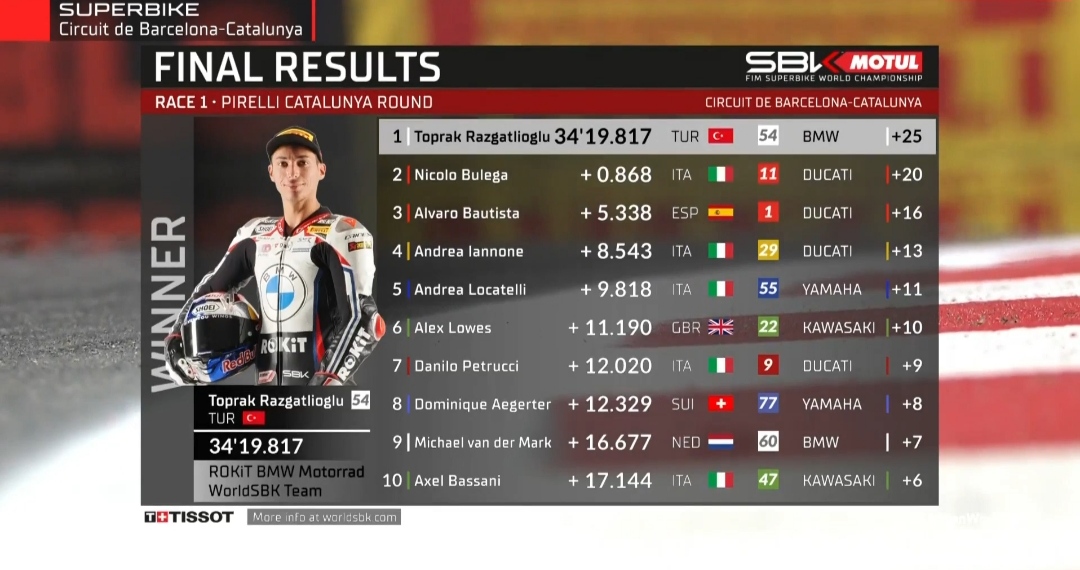 Tapi menjelang 3 lap terakhir ada moment gila dari Toprak. Gap luar biasa ia potong 0.300 tiap sektor. Final lap Bulega bisa di Teluk di R5 tak lain tempat dimana Toprak di overtake Bulega saat lap awal. Kemenangan yang di nanti BMW sejak 2013 akhirnya bisa di persembahan oleh pembalap asal Turki tersebut.