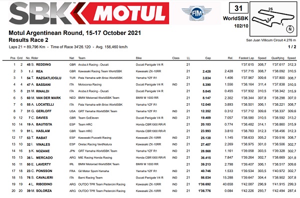Perolehan ini membuat persaingan point klasemen sementara untuk menentukan juara dunia WSBK 2021 di tentukan pada seri akhir di Mandalika 20 – 21 November 2021 nanti. Saat ini Toprak memimpin 30 point dari Rea.
