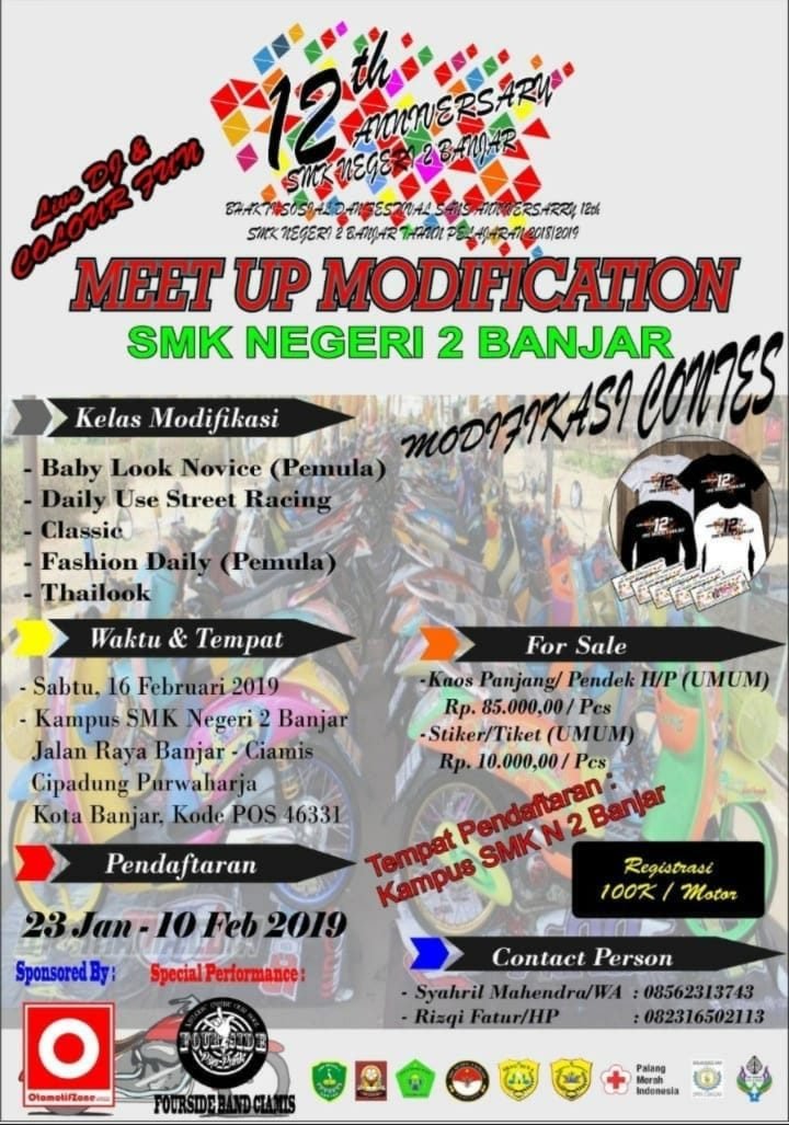 OtomotifZone.com – Banjar. Dalam rangka merayakan Hari Ulang Tahunnya yang ke 12, SMKN 2 Kota Banjar salah satu acaranya dengan menggelar kontes modifikasi. Tentunya diantara acara menarik lainnya seperti penampilan band dan acara menarik lainnya.