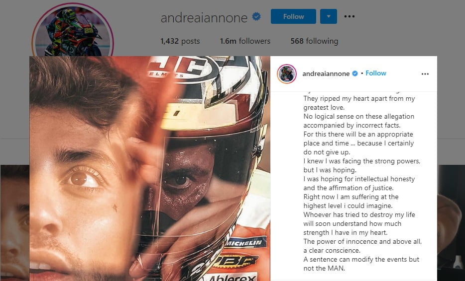 Pengumuman tersebut ketok palu semalam waktu setempat terkait pembalap italia Andrea Iannone ditemukan telah melakukan pelanggaran aturan anti-doping (ADRV) yang di sinyalir adanya Drostanolone, anabolic steroid. Sidang yang sudah di laksanakan bulan lalu sudah mencapai final. Kenyataan pahit yang harus di terima Iannone jika harus diam tak balap selama 4 Tahun. Iannone akan di tangguhkan mulai 17 Desember 2020.